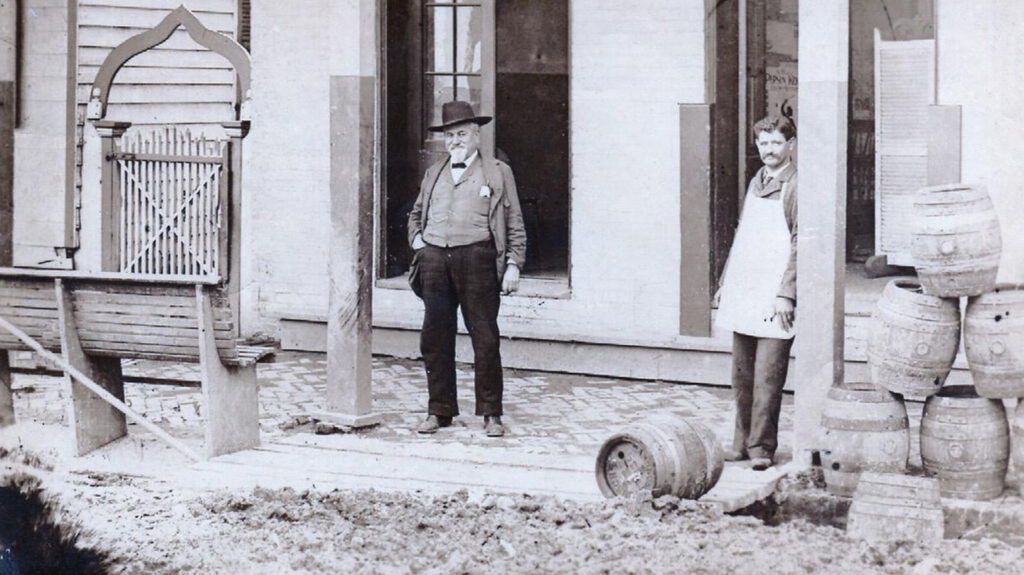 Here a mature Laurent Bazus (left) and his assistant Fernand Seigneur (right) await customers at the Main Street establishment.  The empty wine barrels suggest a happy story of their own.
